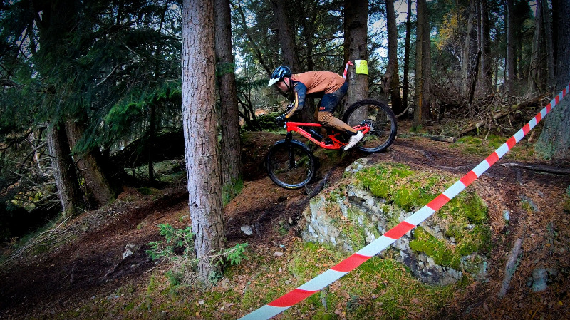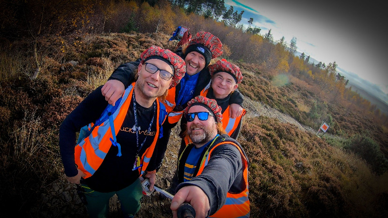 Following a short safety briefing, a solo bagpiper led the Clans out onto the copper-toned Strathearn hillside towards the battleground of five timed downhill stages. Muckmedden’s forty-strong team of happy Marshals, dressed in bright orange vests and wearing tartan bunnets lined the challenging 15km course ringing cowbells, blasting out tunes and keeping the riders safe and motivated on the relentlessly slippery rocks and roots of Comrie Croft.