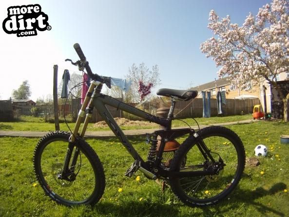 fox vannila rc rear shock, marzzochi bomber super t pro fork's with a 210mm front hayes disc brake xt group set, mavic wheels. It is a 18 speed 9speed xt cassette and kona twin ring front set up.