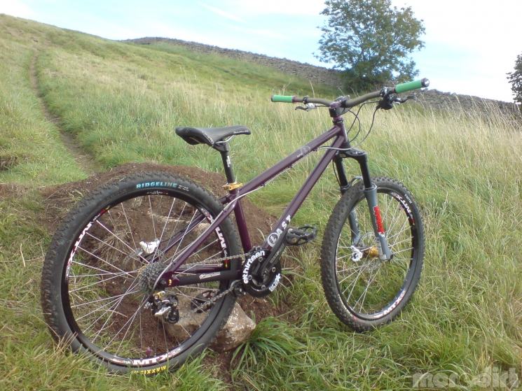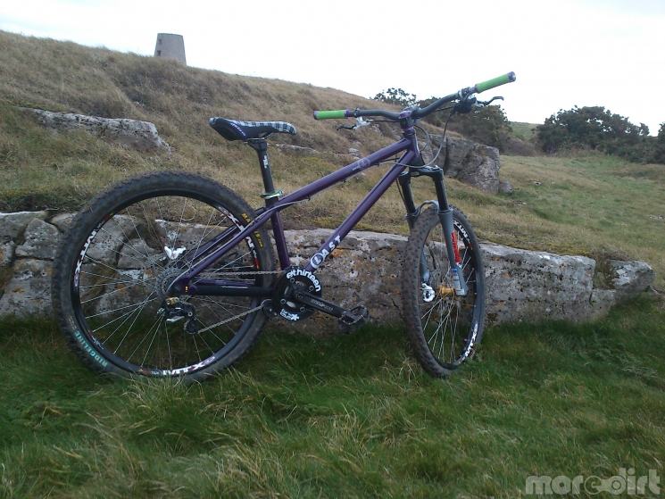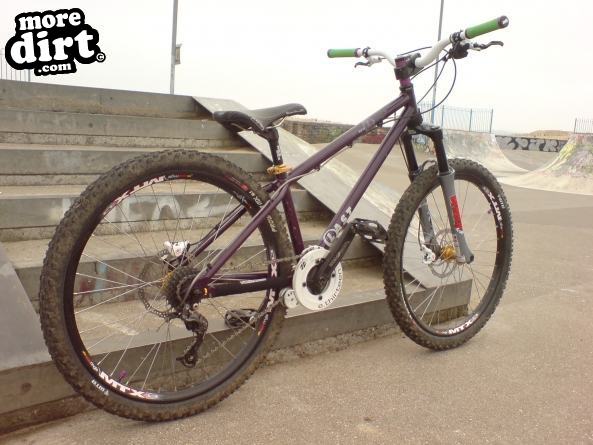 Last Rufus cromo frame, Marzocchi DJ1 forks, Formula Oro K24 brakes/7 inch rotors, Raceface Evolve DH cranks, E13 STS chainguide and bash, SDG Bel Air Ti rail saddle, RF Diabolus seatpost, RF Diabolus stem, Easton Havocl bars, Odi rogue lock on grips, sram attack 9spd shifter, Shimano saint shadow rr deraileur/ goodridge cable, crank bros seatclamp, crank bros rr qr, hope pro2 20mm front hub 32h/ dt swiss pg spokes/ sun ringle mtx33 rim, maxxis advantage f tyre, gusset headlock bolt thru, Halo spin doctor rear hub 36h/ SunRingle mtx33 rim/ DT swiss champion pg spokes/maxxis crossmark rr tyre/ Mavic FR tube/ Sram pg990 11-32 cassette, KMC X9 93 chain, rf diabolus bottom bracket, NC17 dirt jump s-pro pedals..and all running smooth on rock n roll greases..