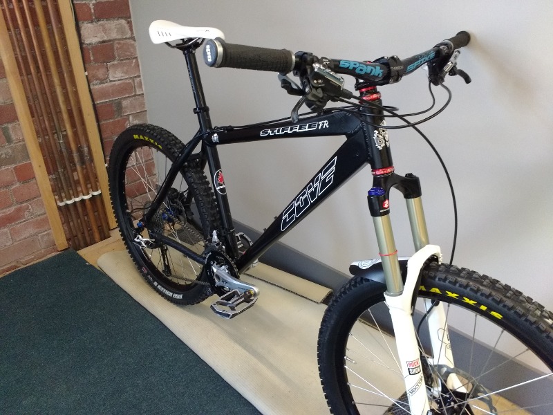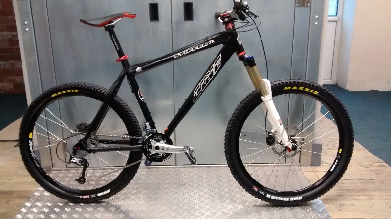 Sektors 150mm , 20mm they axle , XT Brakes XT crank 2 x 9 , Blackspire chain rings and guide , Raceface bash ring , Mavic EN521 Wheels , Hope pro 2 hubs , Hope headset , Thomson seat post , clamp & stem , Spank spike bearclaw FR 777 bars , ODI , Maxxis high roller 2/4" , SRAM cassette & chain , Gobi saddle.