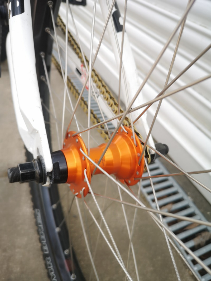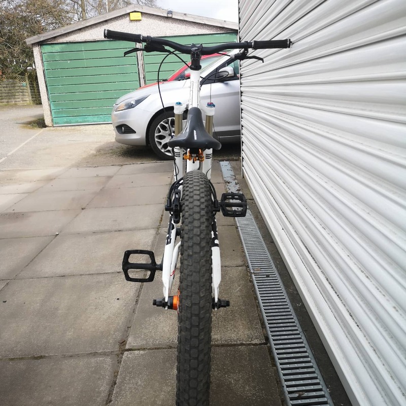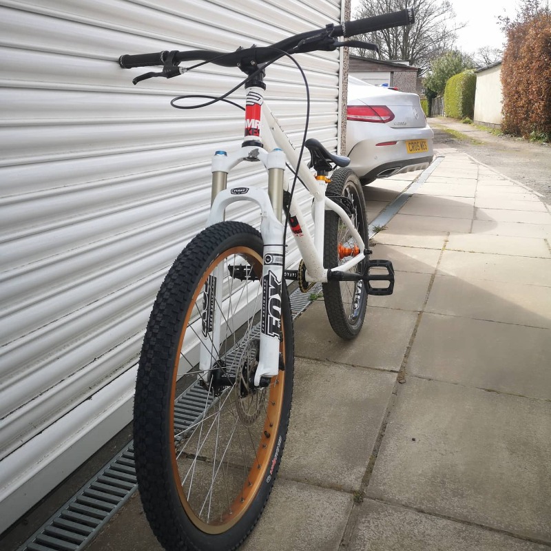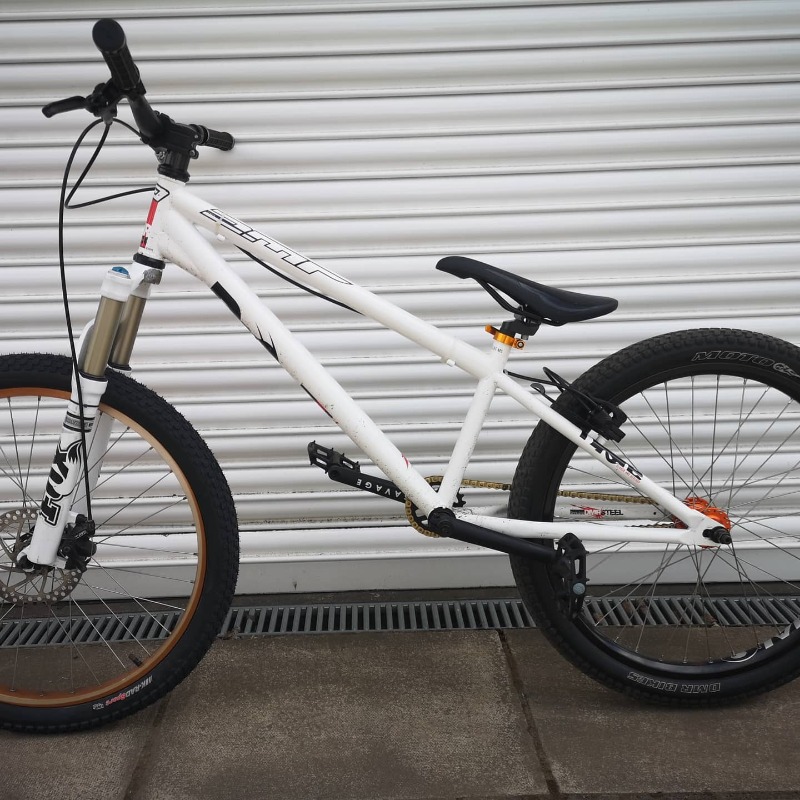 Custom built dirt jump bike. DMR drone frame, 24" wheels, fox float forks, nukeproof saddle, savage bmx cranks, micro gearing, hand built rear wheel. Cult bmx hub, DT Swiss spokes, halo SAS rim, dmr Moto tyre. Front has rhino lite sun rim, kenda k-rad 2.3" tyre, Shimano deore xt hub, dmr V6 pedals, tektro front disk brake, hydraulic rear rim brake (super powerful)
